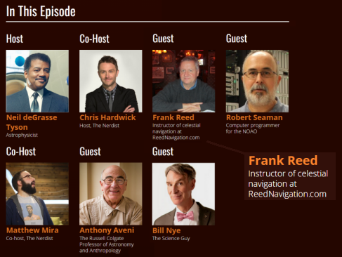 I was recently a guest, aboard as an expert in celestial navigation, on StarTalk, a science talk-show hosted by Neil deGrasse Tyson available on various streaming services (look for S4 E10). Dava Sobel, author of "Longitude" also joined us in the studio for one segment. Also available as audio-only (free).